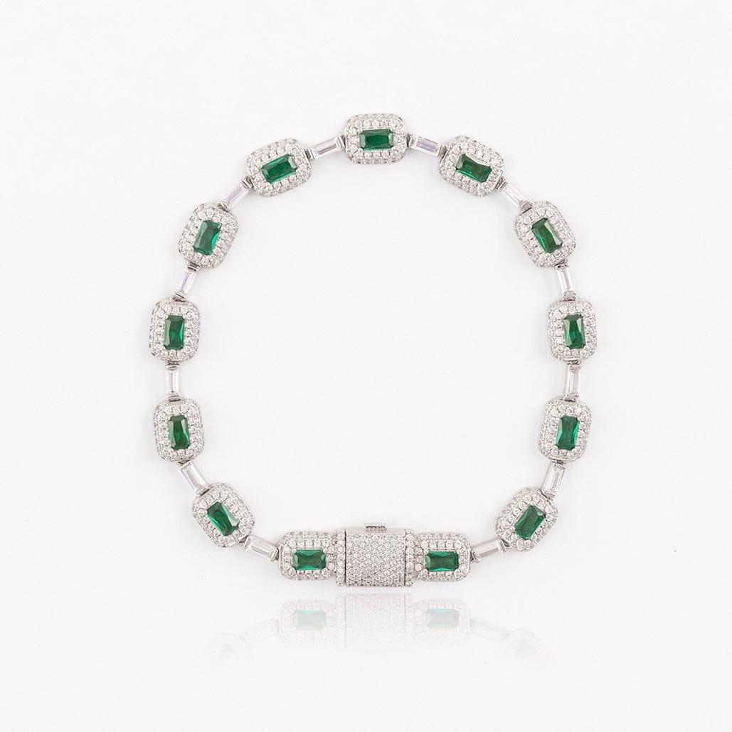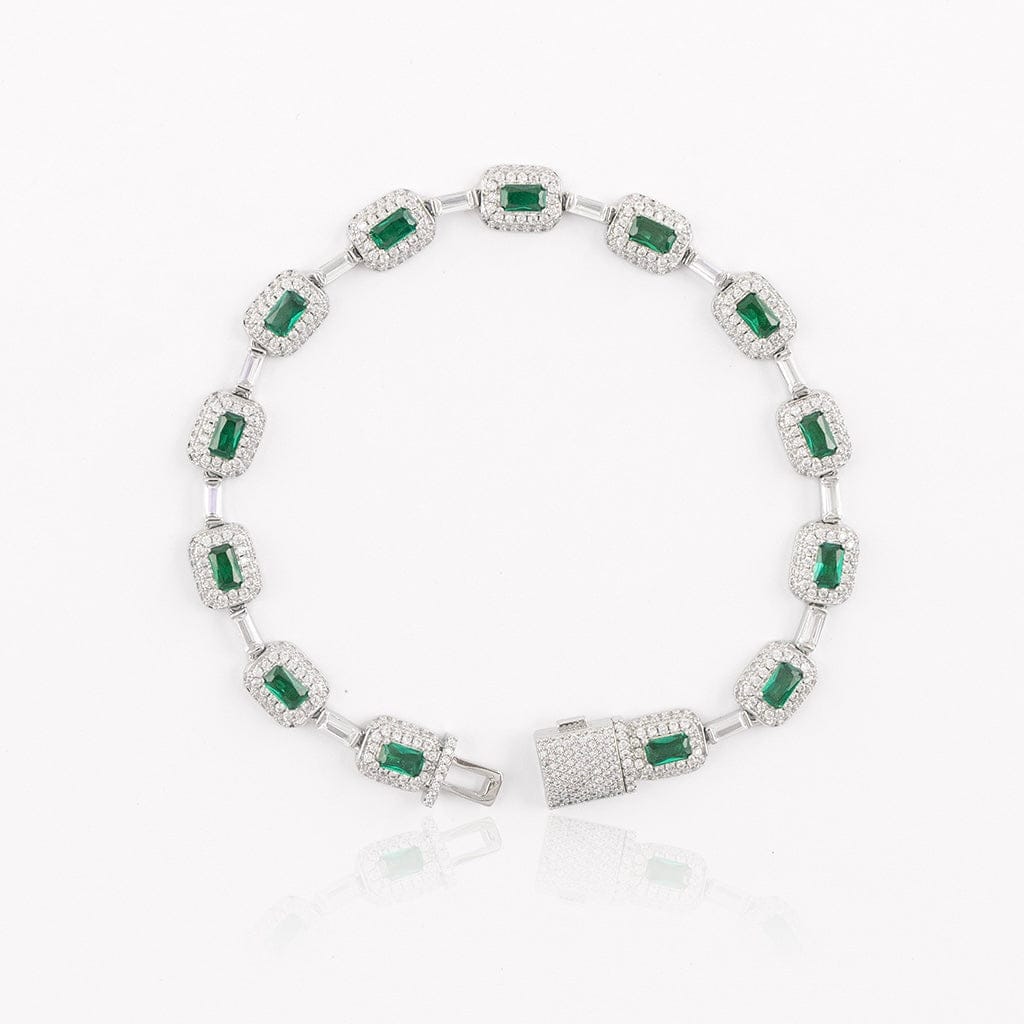 Elevate your jewelry collection with this stunning iced-out bracelet. Meticulously crafted, this piece features radiant emerald-cut green stones, each framed by a shimmering halo of premium-quality cubic zirconia for that bold and timeless sparkle.
