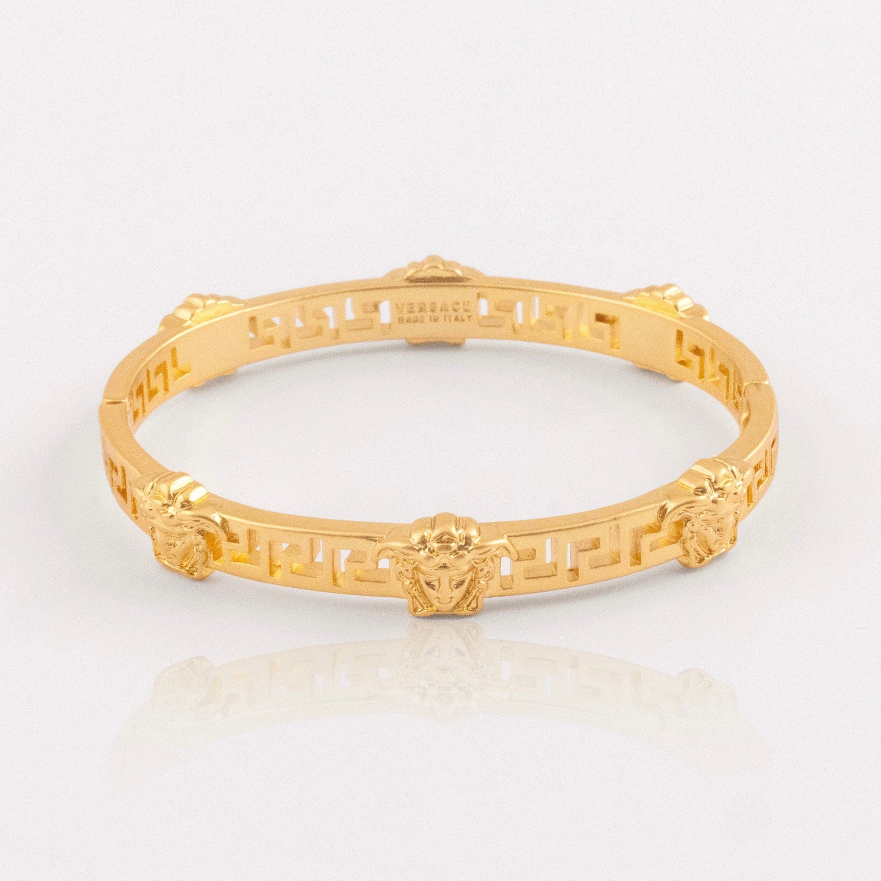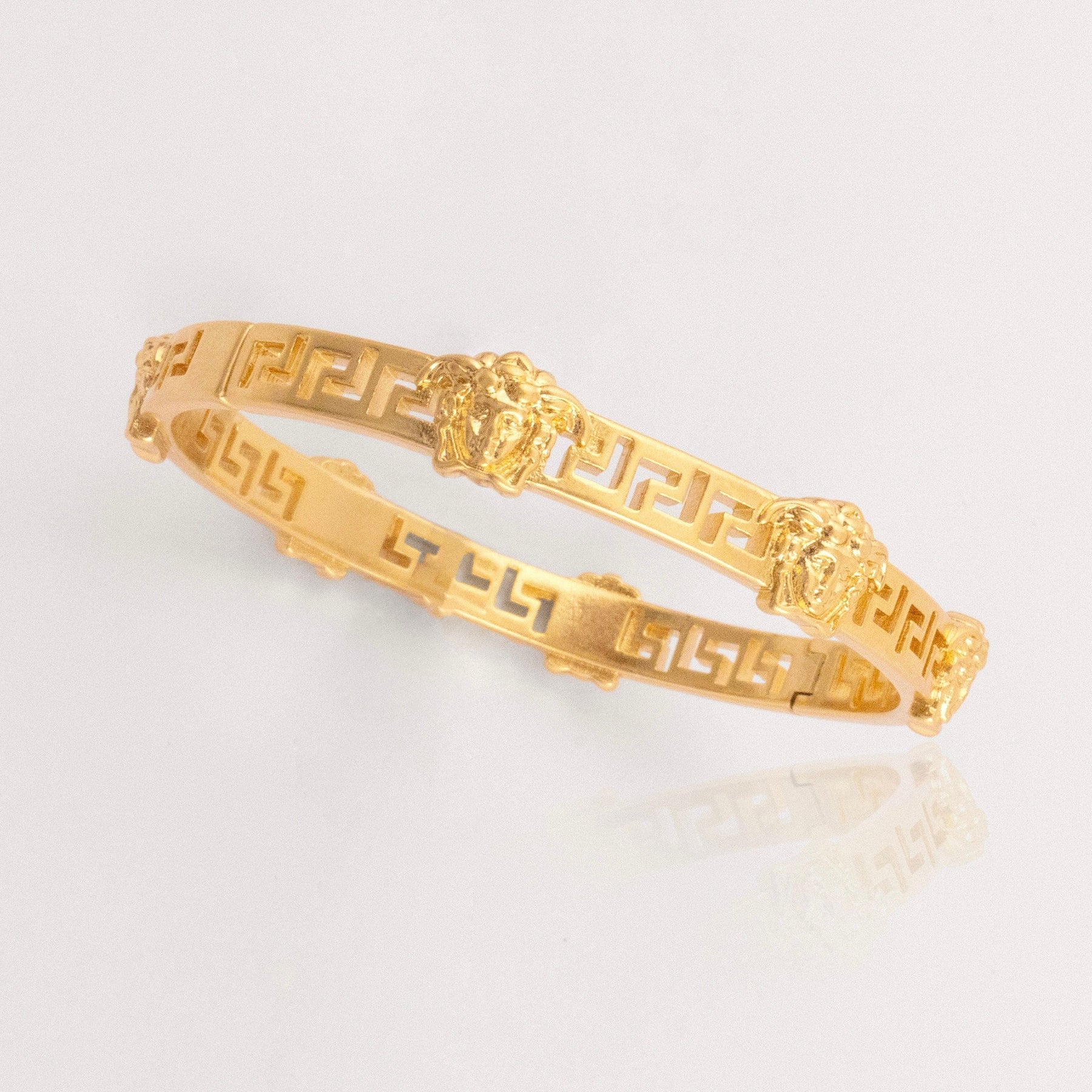 Elevate your style with this exquisite gold bracelet featuring an iconic Greek key pattern and detailed lion head accents. This statement piece combines timeless classical design with modern luxury craftsmanship.
