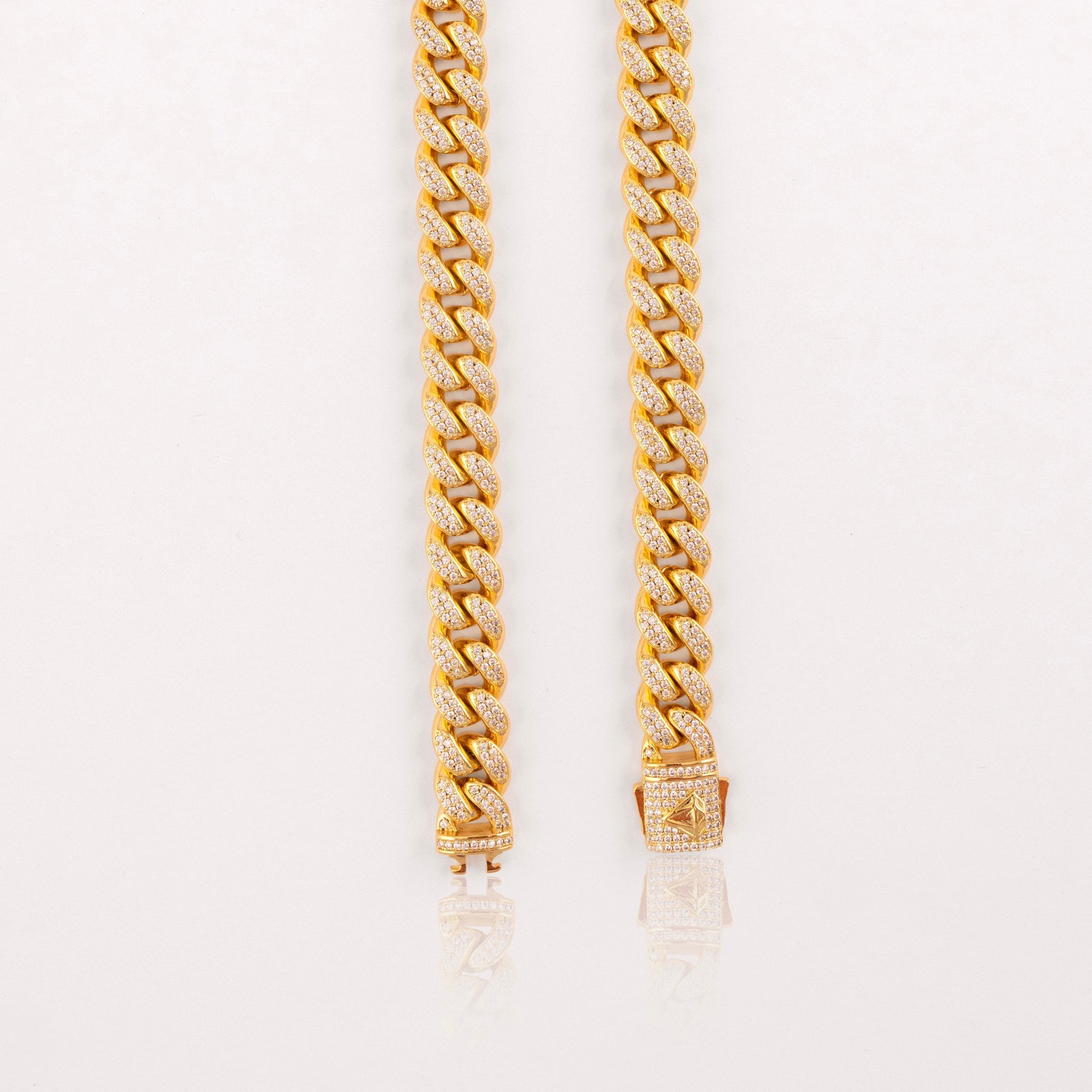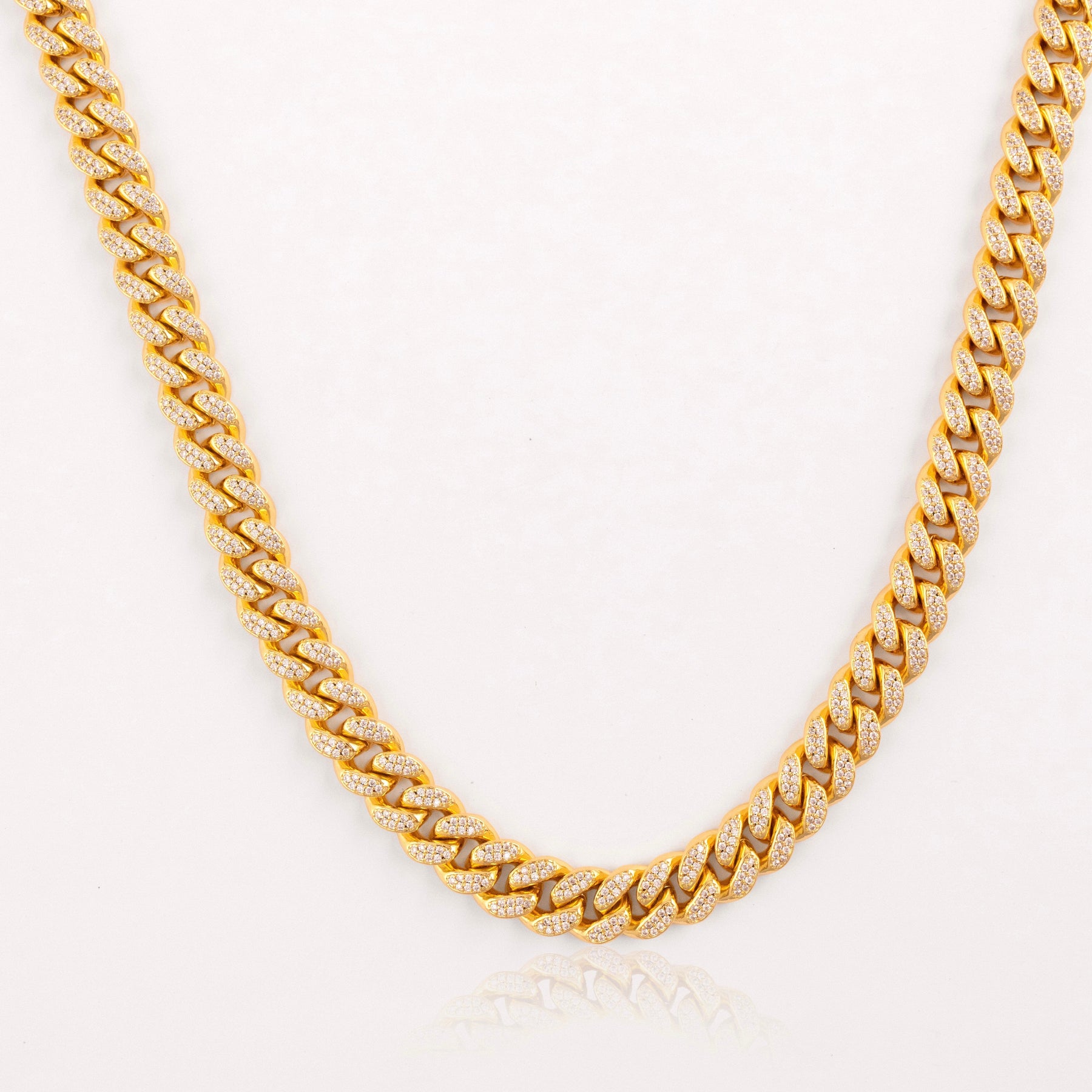 This 12mm Cuban link necklace stands out with its bold presence and luxury feel. Each link features a thick layer of shimmering stones, creating a bold iced look. The gold finish adds a rich look that matches both casual and formal outfits. The 12mm width gives this necklace a true statement style.