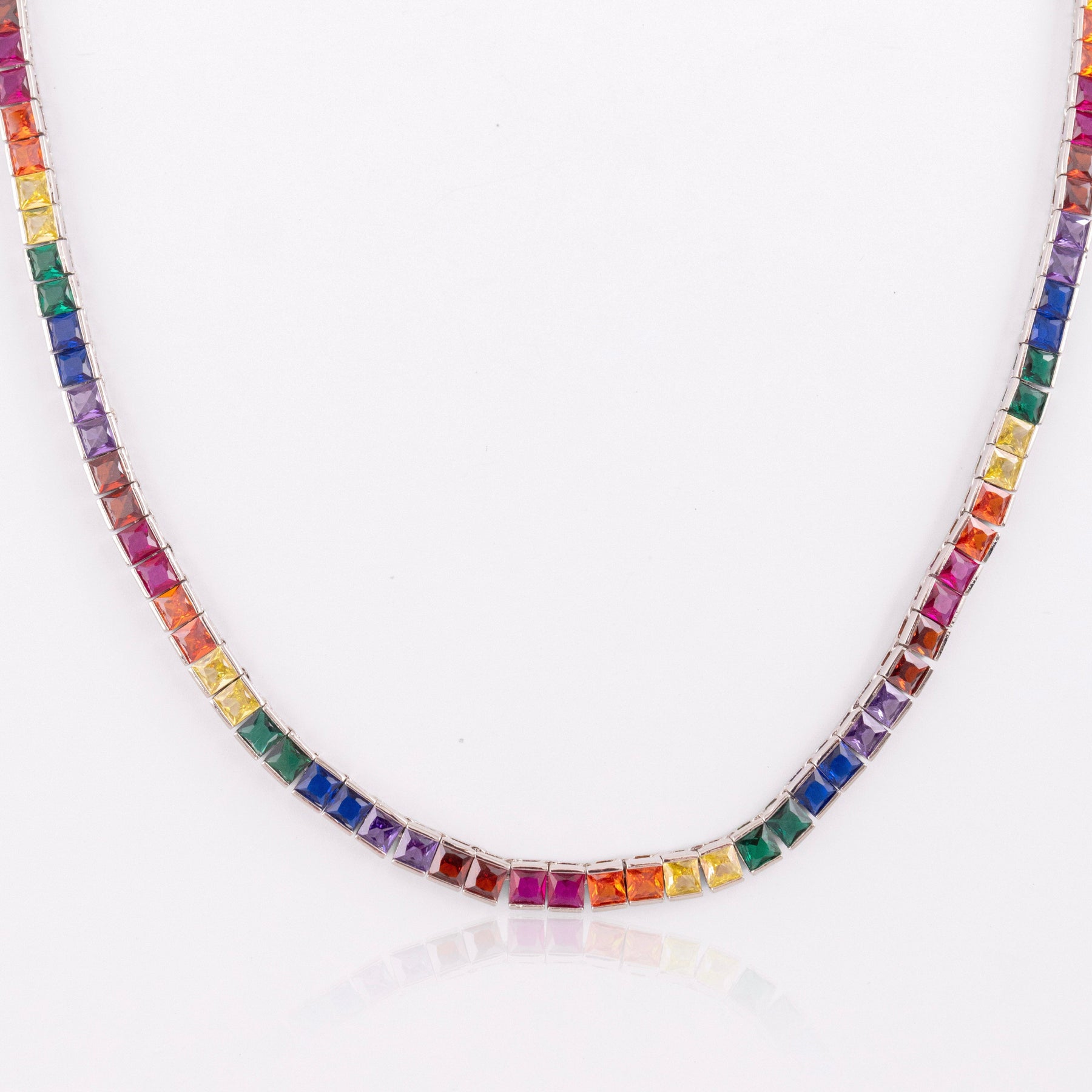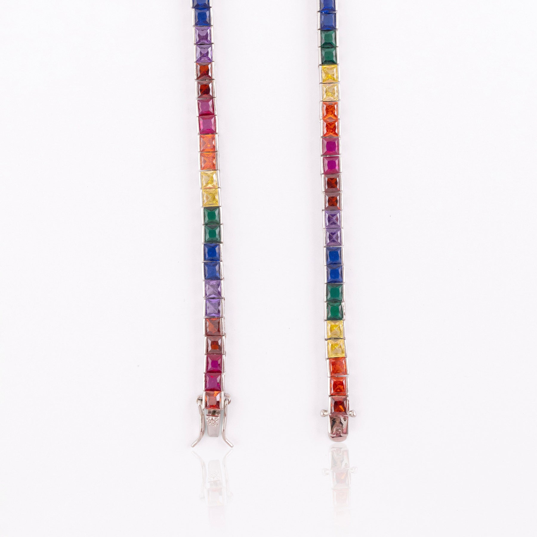 Turn heads and express your bold side with the Radiant Rainbow Baguette Tennis Chain. This vibrant piece features meticulously set baguette-cut stones in a full spectrum of dazzling colors, creating a sleek and elegant silhouette with a powerful pop of personality.
