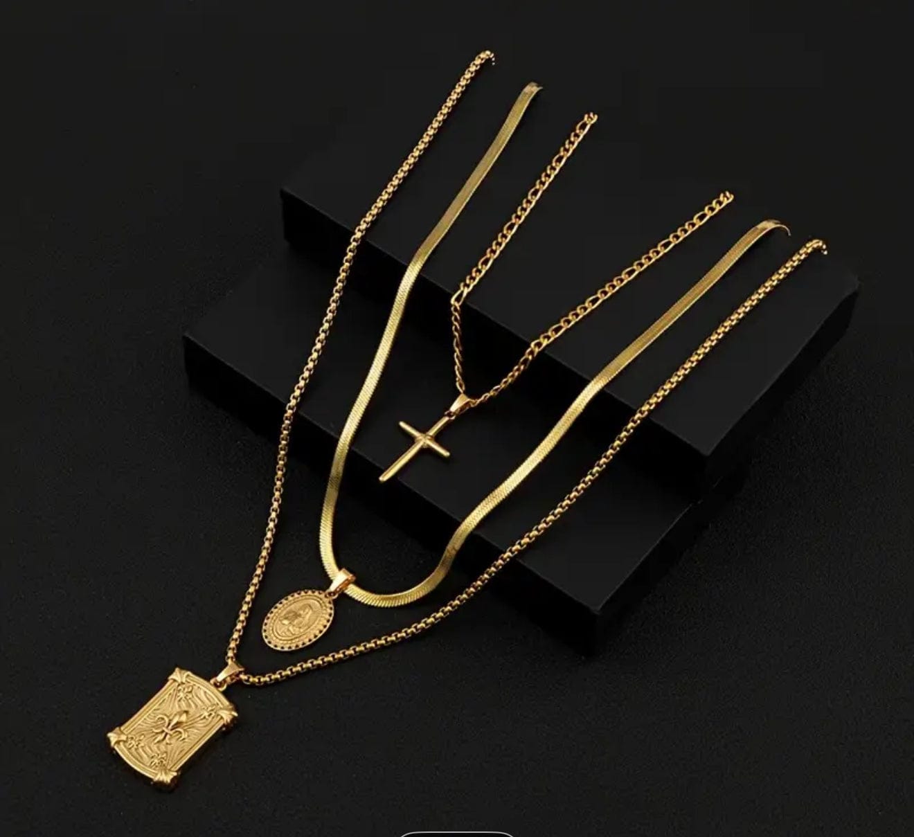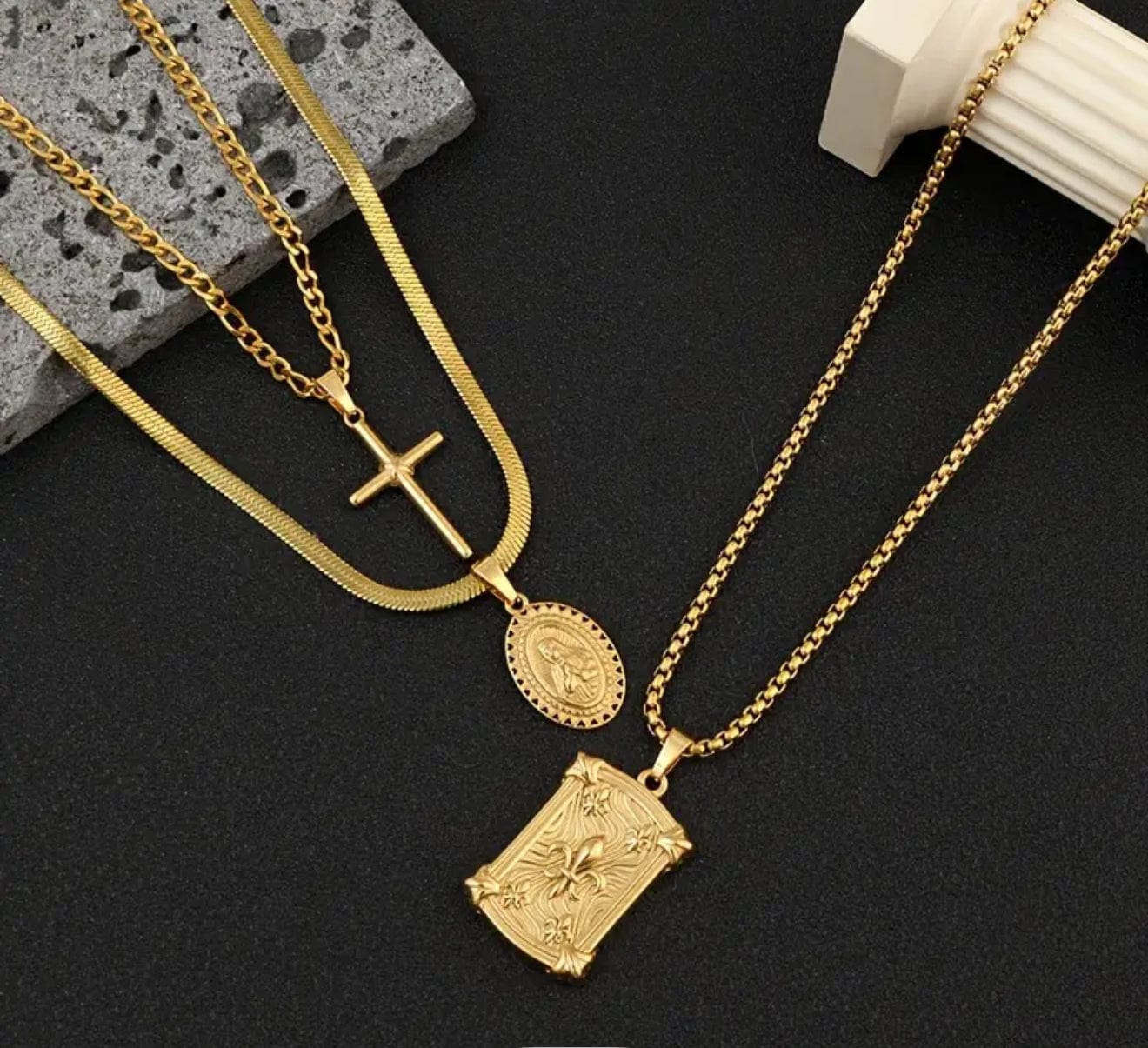 3set-Retro Relief Stainless Steel Maria Cross Pendant Necklace Set - Stylish French Iris Flower Design - For Friends, Couples, Family, Daily Gifts And Matching