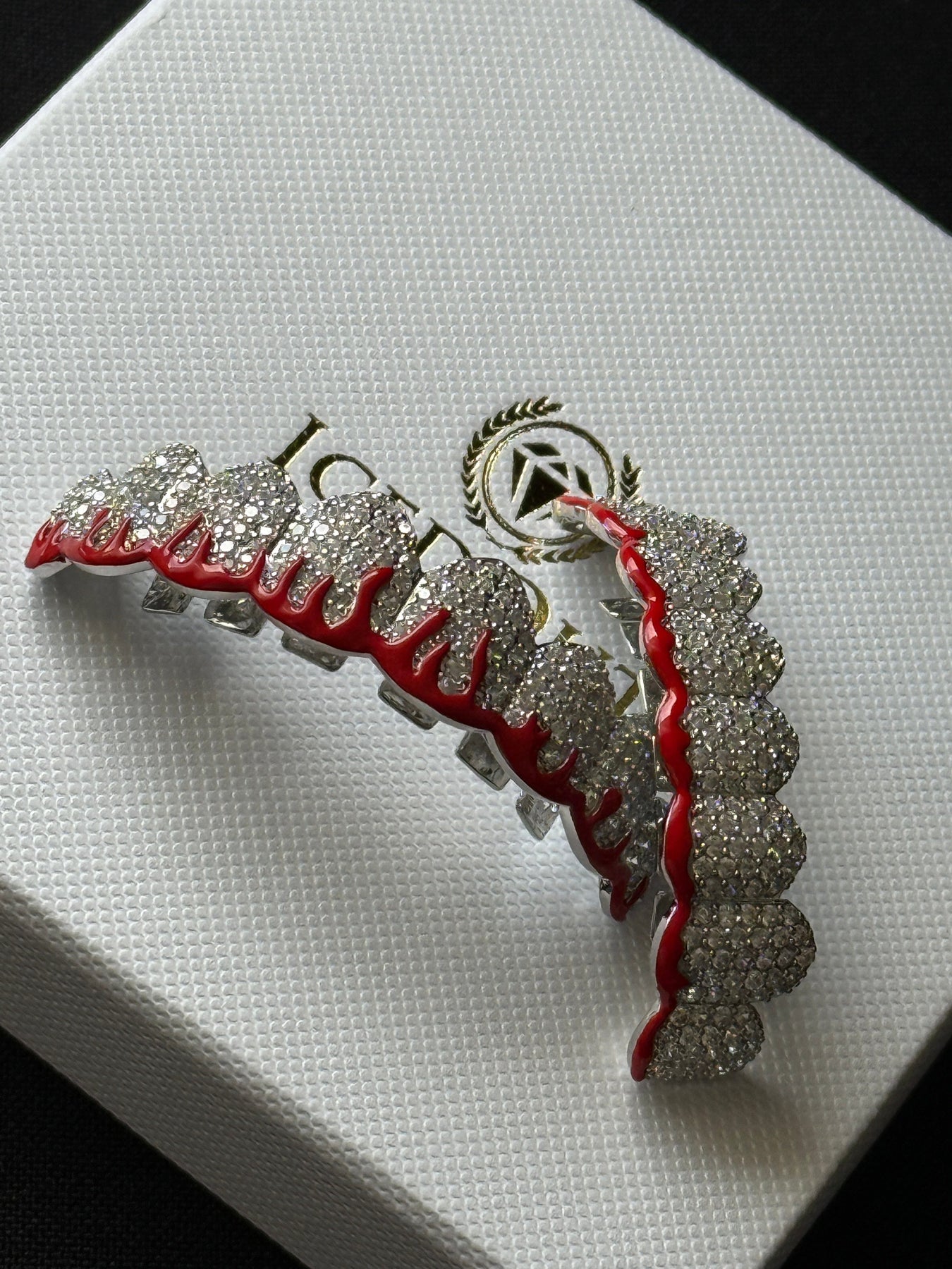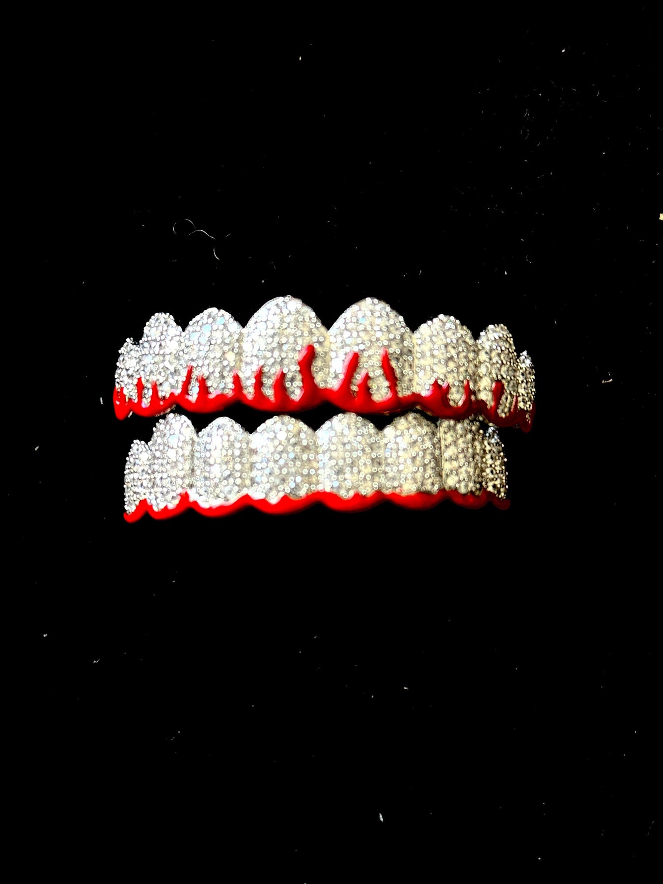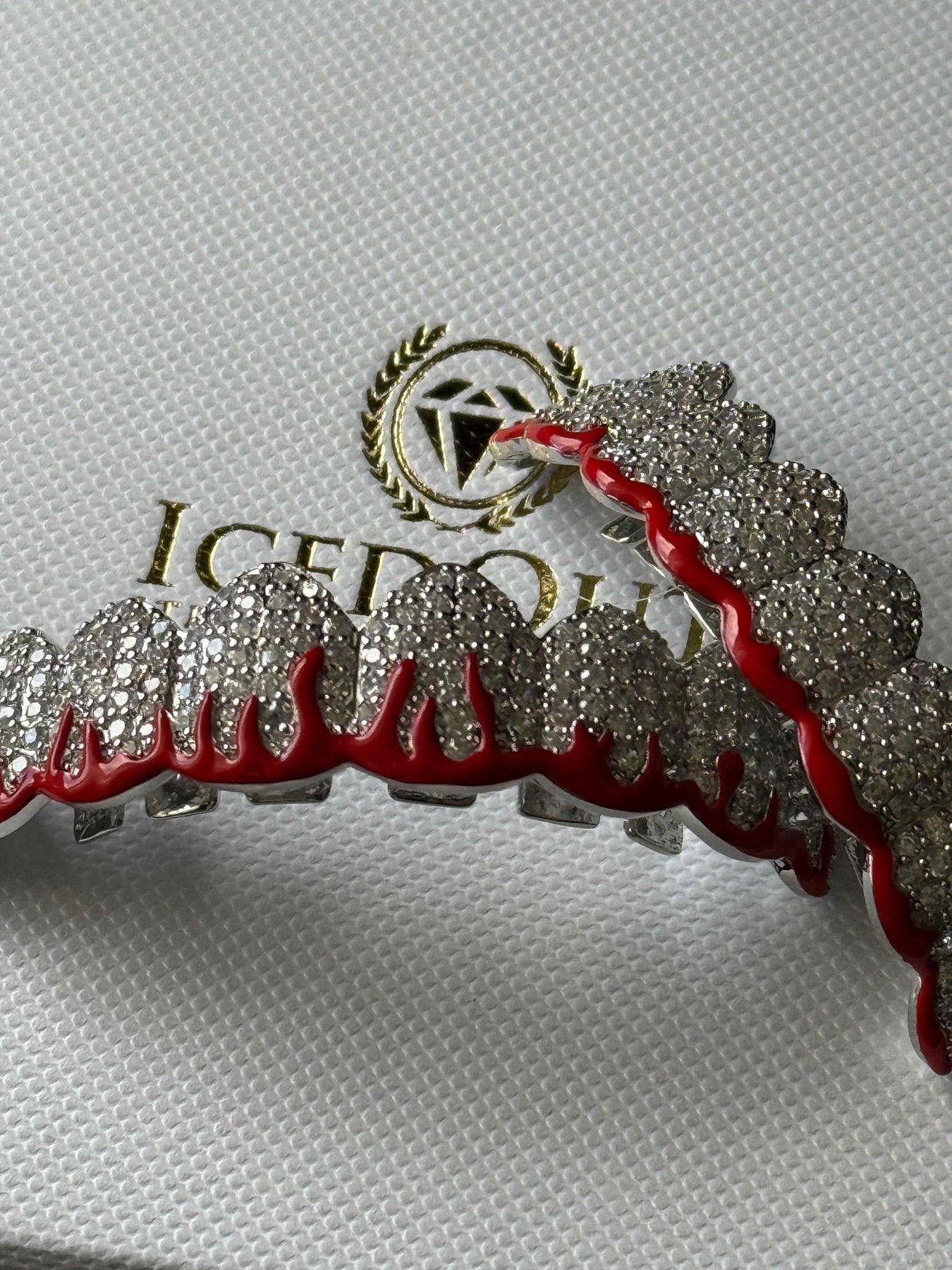 Make a bold statement with this stunning silver grillz set featuring intricate red enamel drip detailing. This premium set includes both top and bottom pieces, crafted with attention to detail for the ultimate iced-out look.