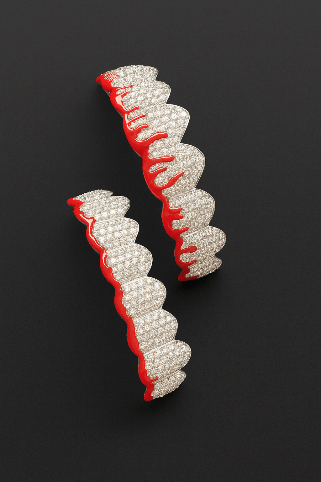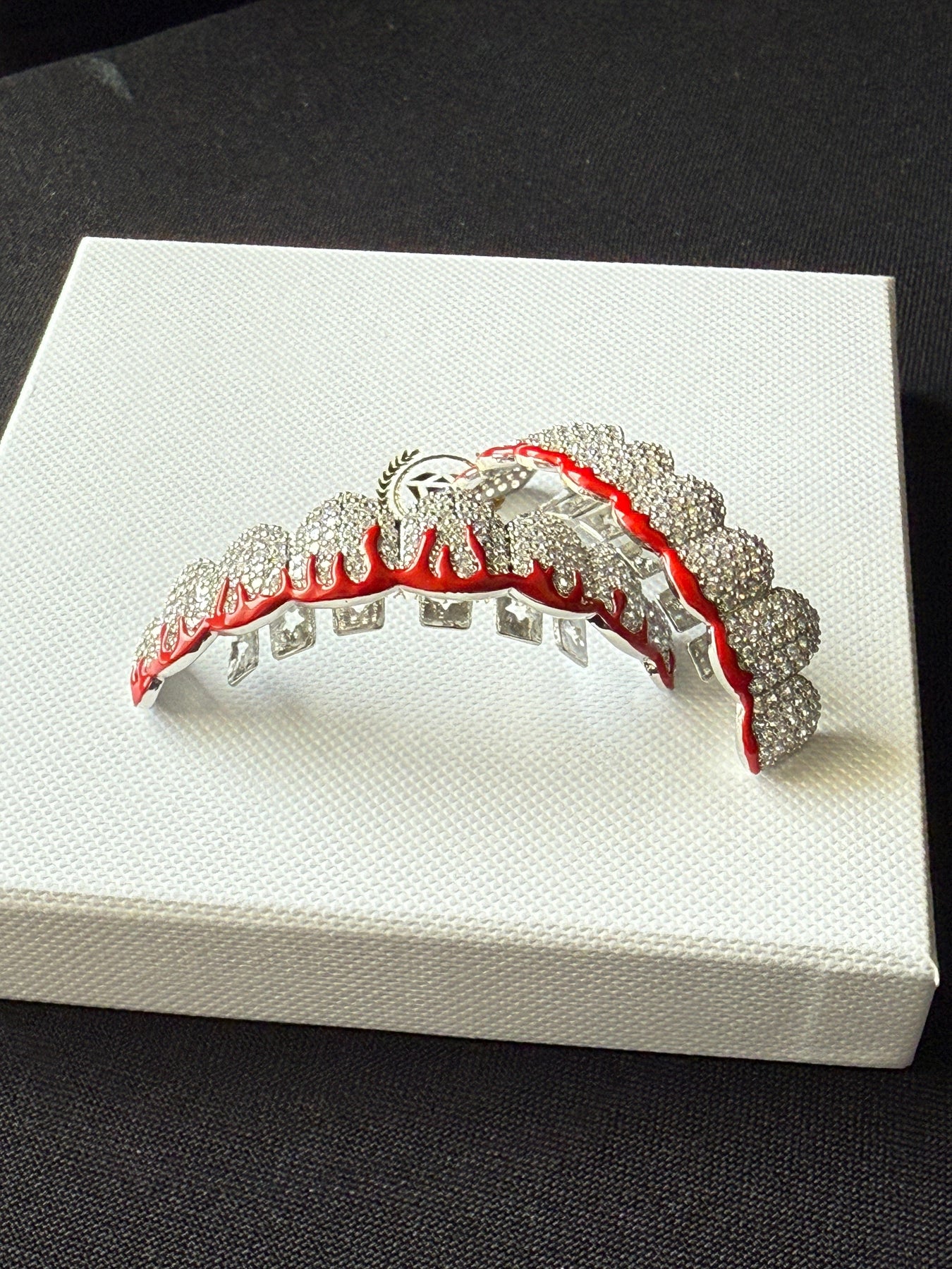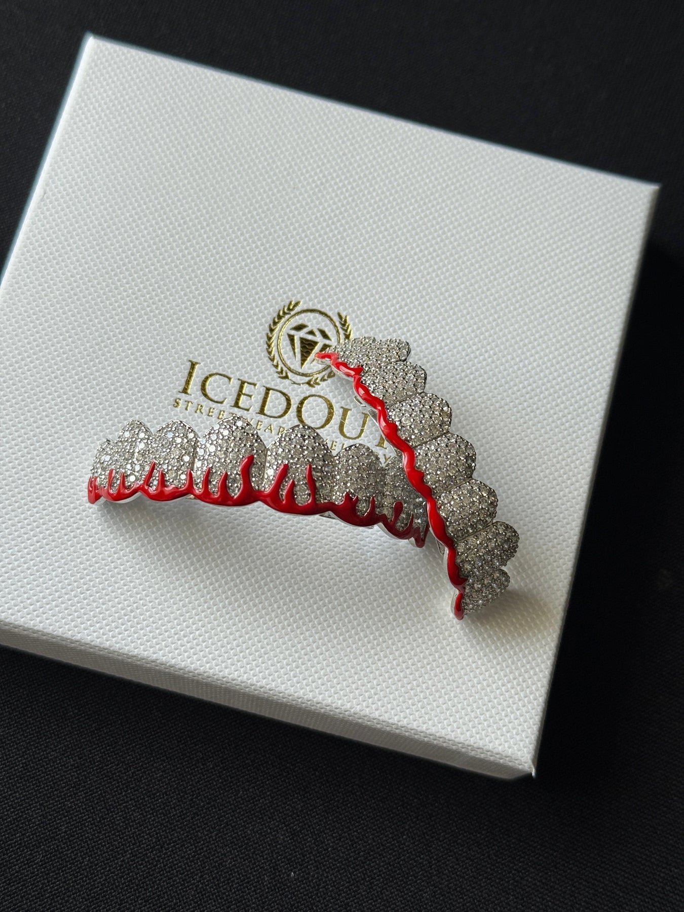 Make a bold statement with this stunning silver grillz set featuring intricate red enamel drip detailing. This premium set includes both top and bottom pieces, crafted with attention to detail for the ultimate iced-out look.
