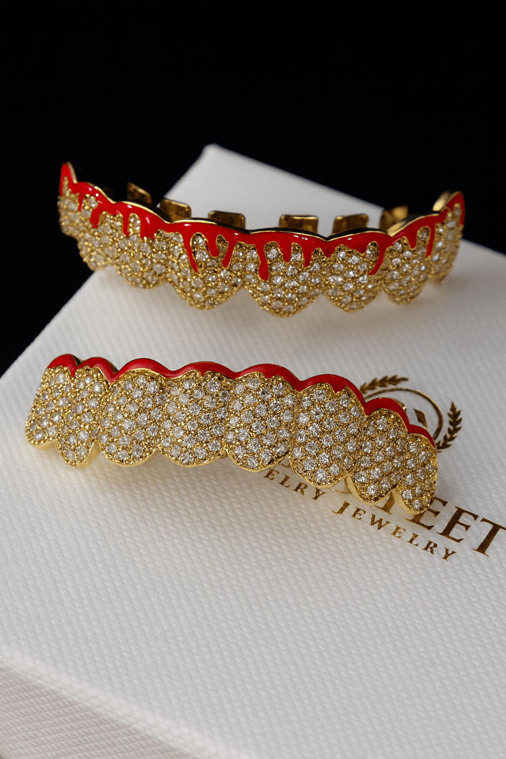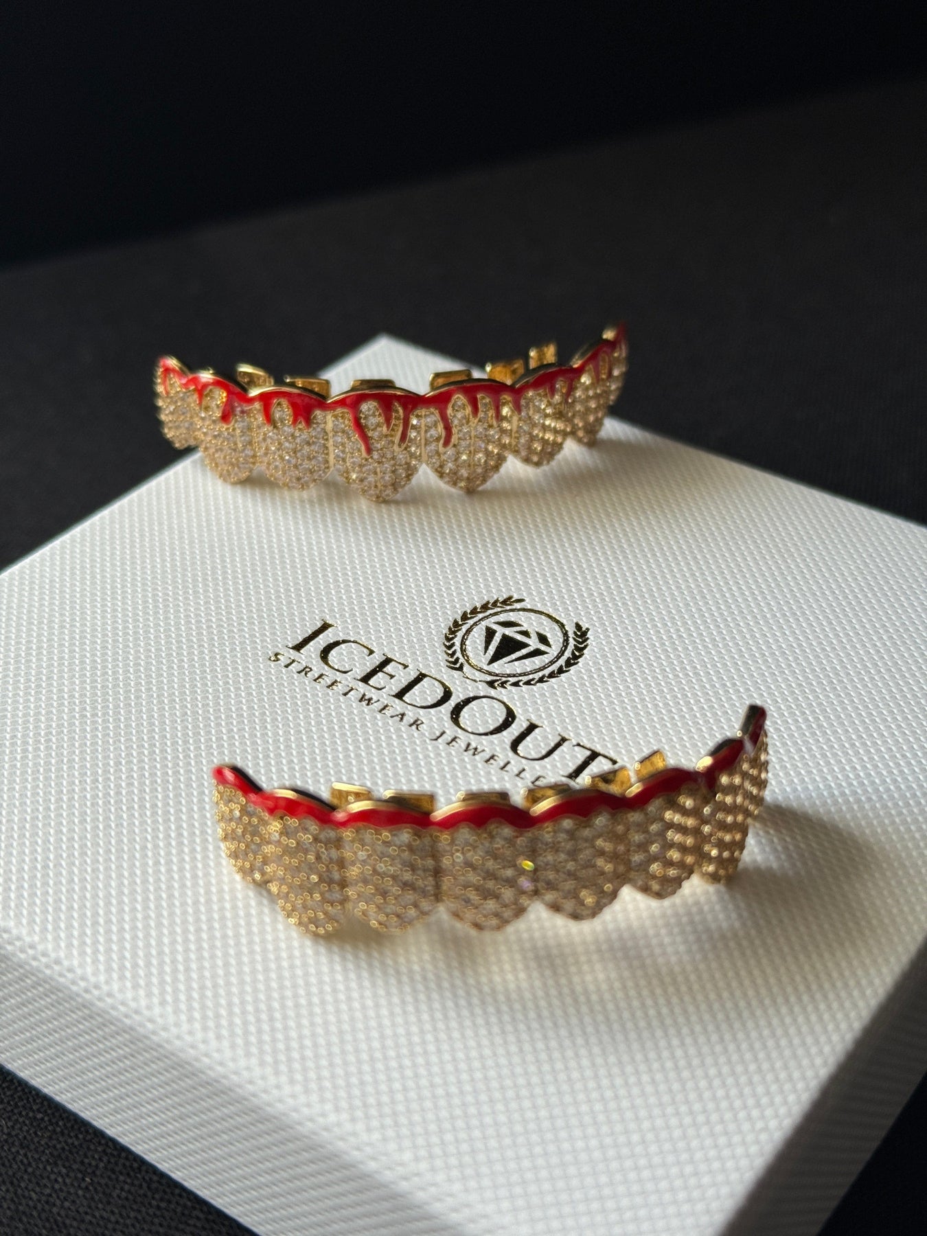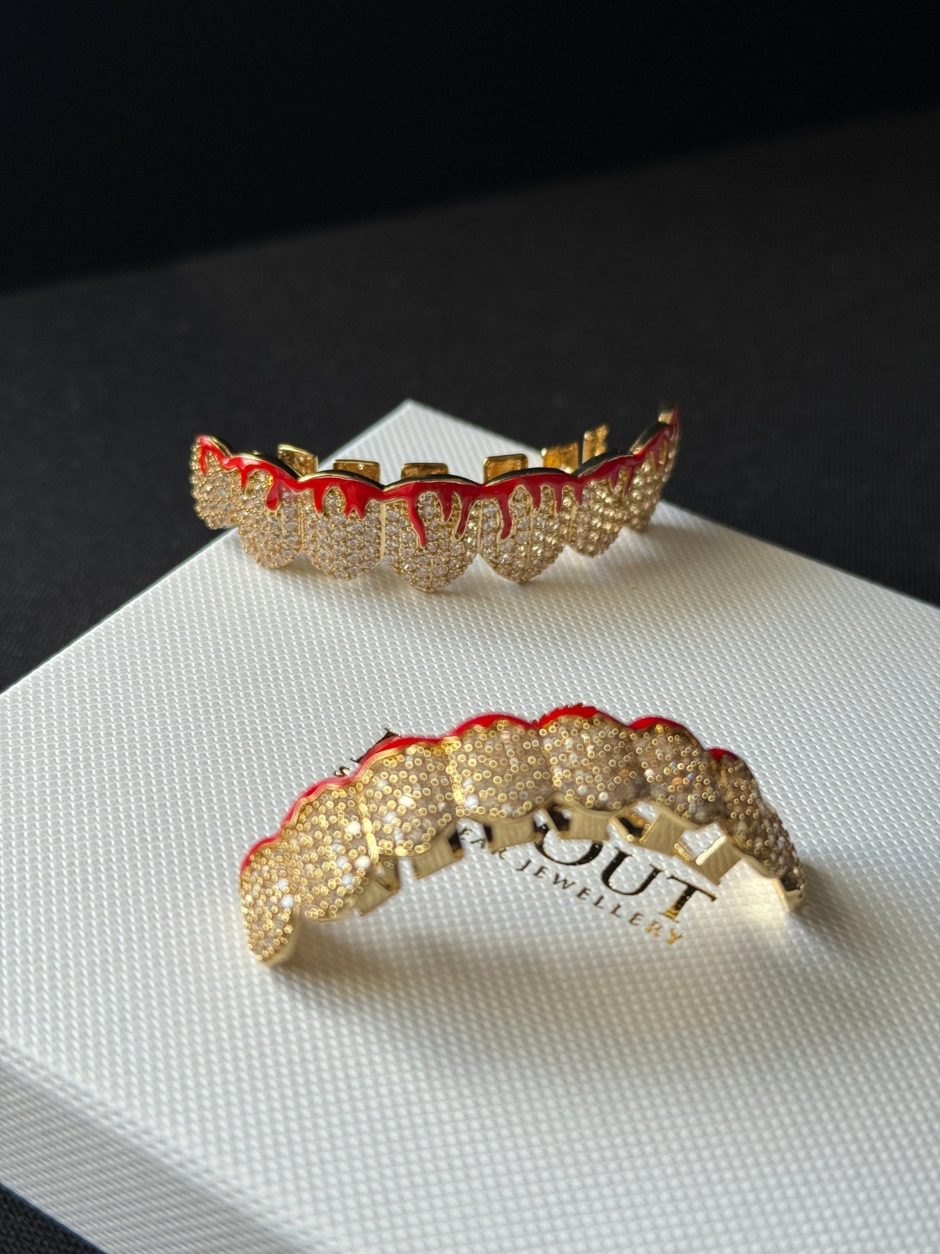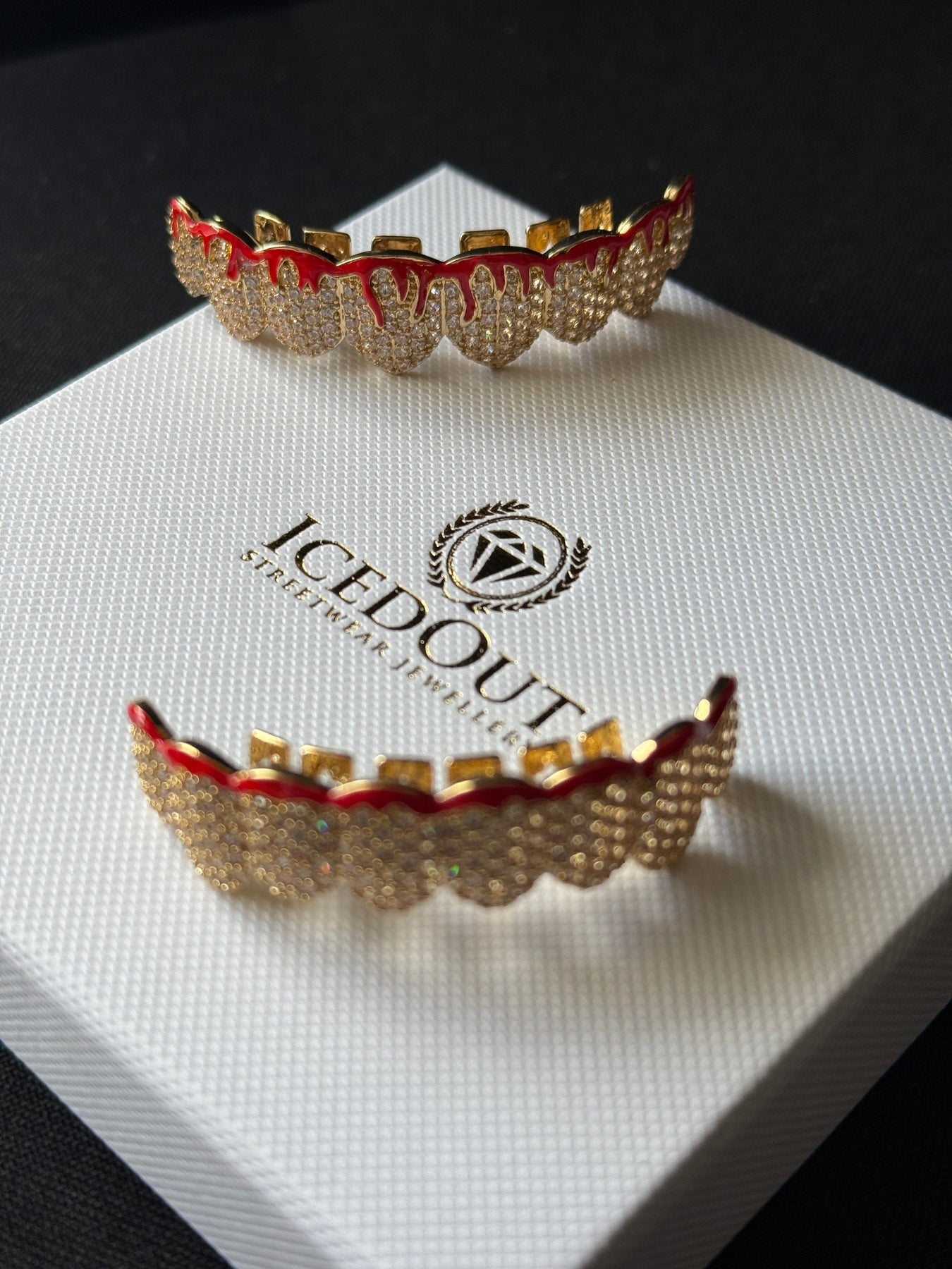 Make a bold statement with this stunning gold grillz set featuring intricate red enamel drip detailing. This premium set includes both top and bottom pieces, crafted with attention to detail for the ultimate iced-out look.