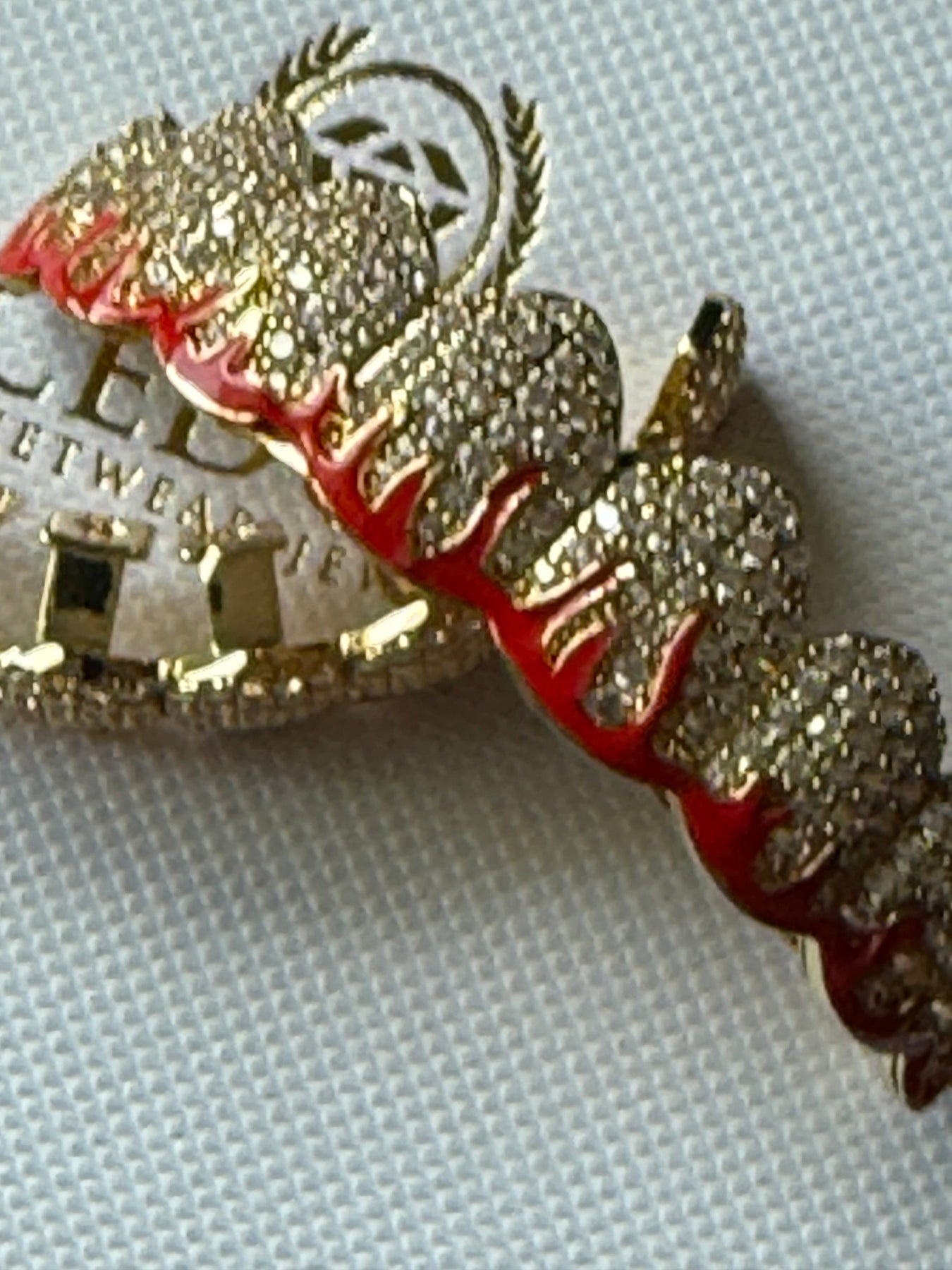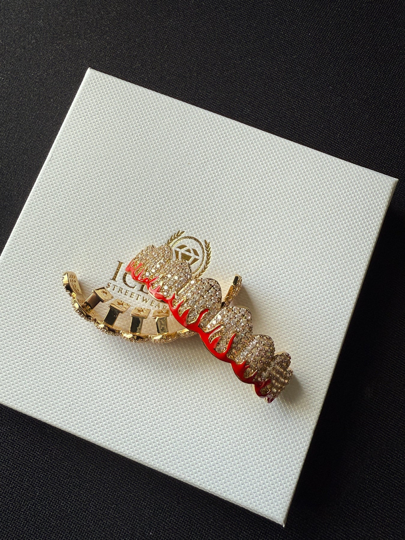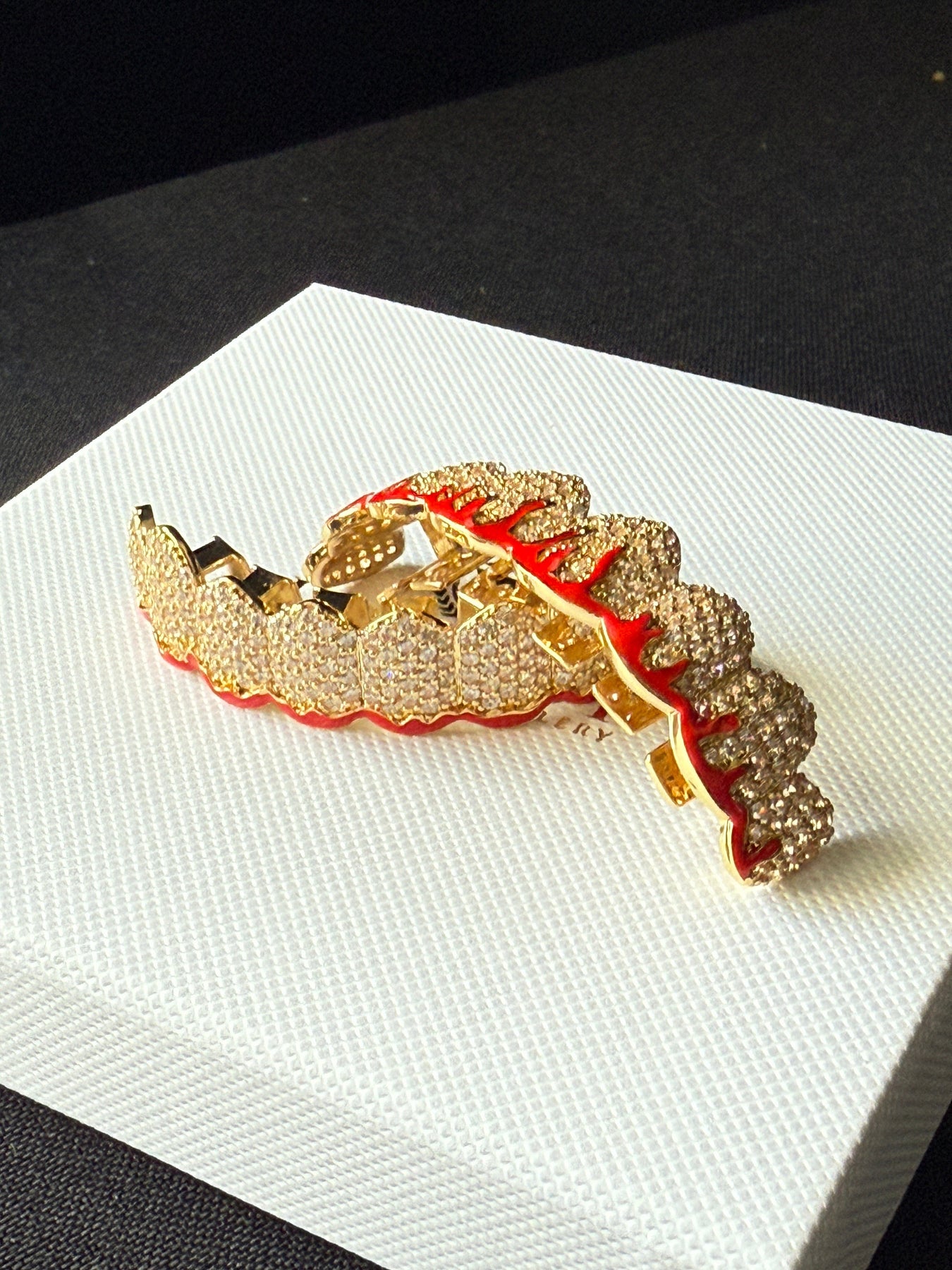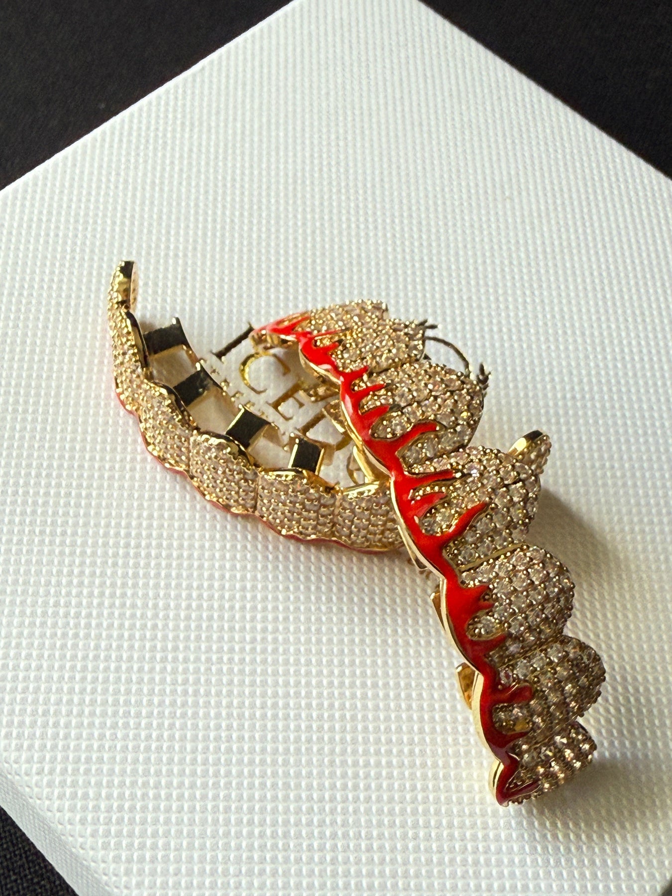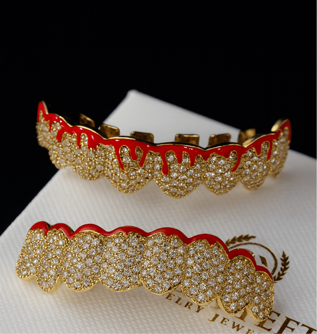 Make a bold statement with this stunning gold grillz set featuring intricate red enamel drip detailing. This premium set includes both top and bottom pieces, crafted with attention to detail for the ultimate iced-out look.