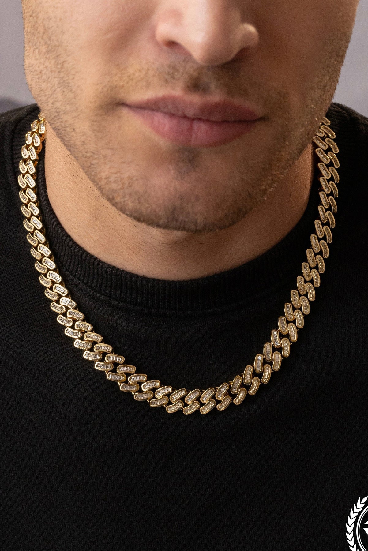 The 12mm IcedOut baguette Cuban chain works well for both casual and formal occasions. Pair it with a T-shirt for a casual streetwear vibe. Add it to a dress shirt or jacket to elevate your evening look. Its iced-out effect brings sparkle, drawing attention but never overwhelming your outfit.