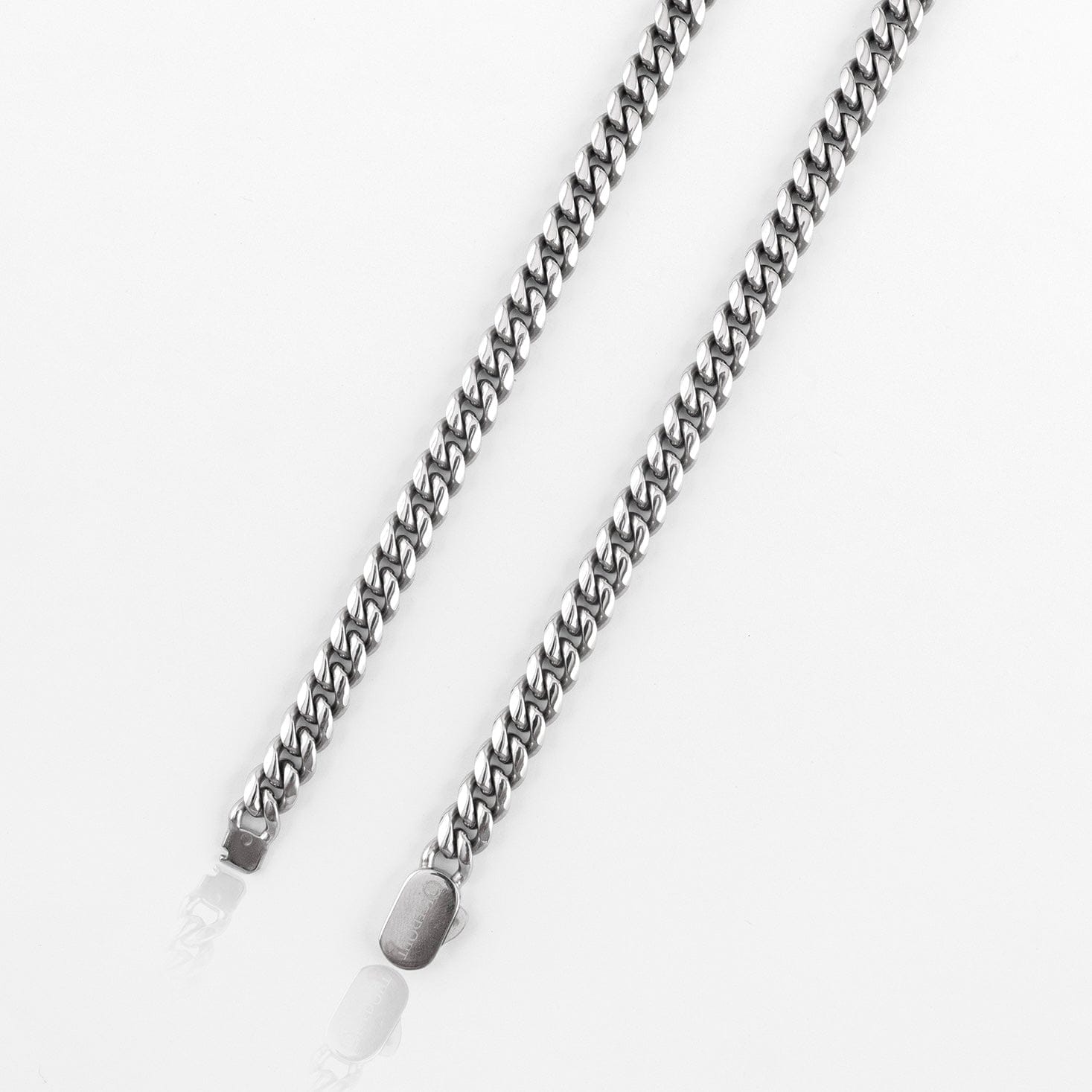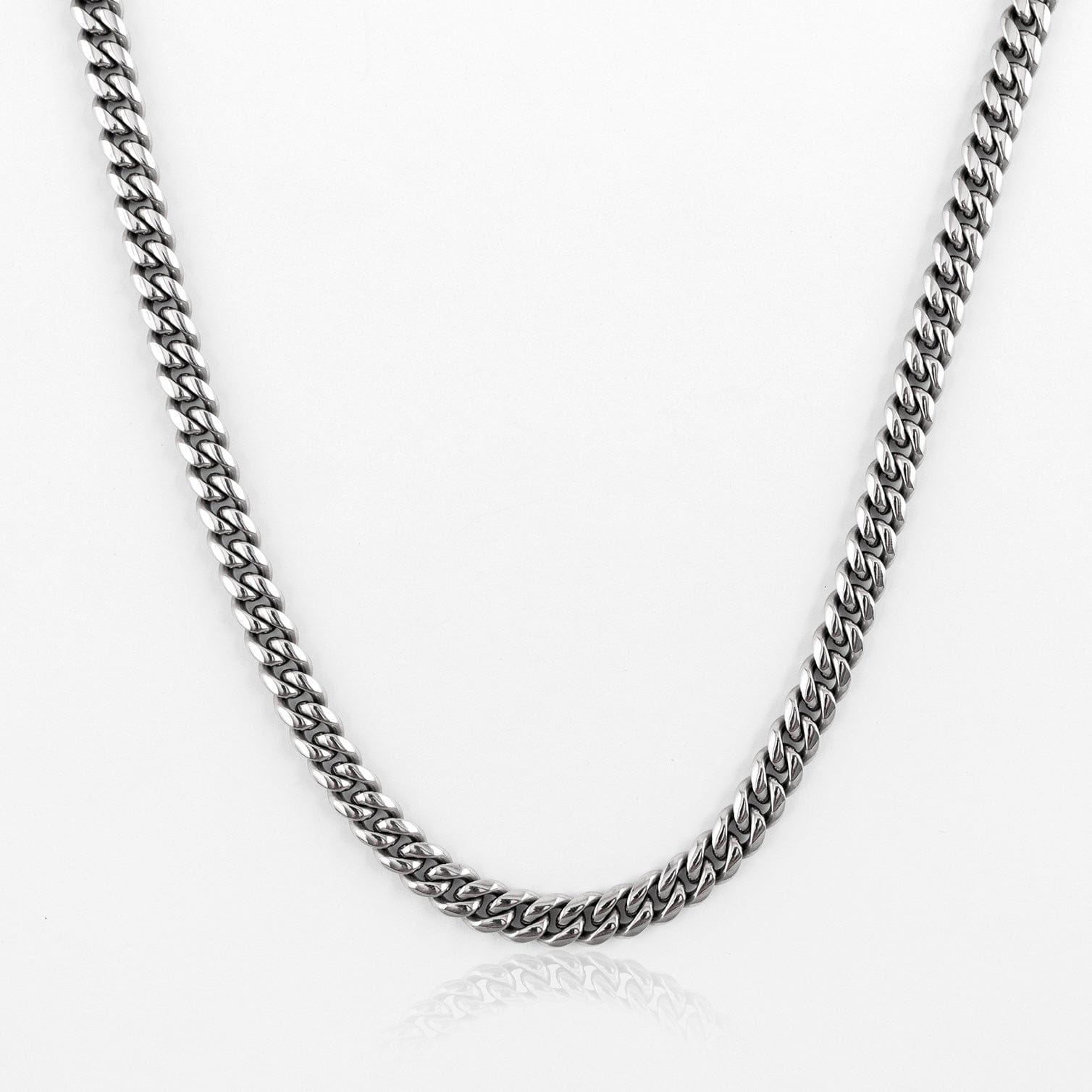Meticulously crafted with attention to detail, this Cuban chain features our innovative C Box Lock design for enhanced security and durability. Each piece is finished in lustrous 18K White Gold plate, ensuring a brilliant shine that lasts.