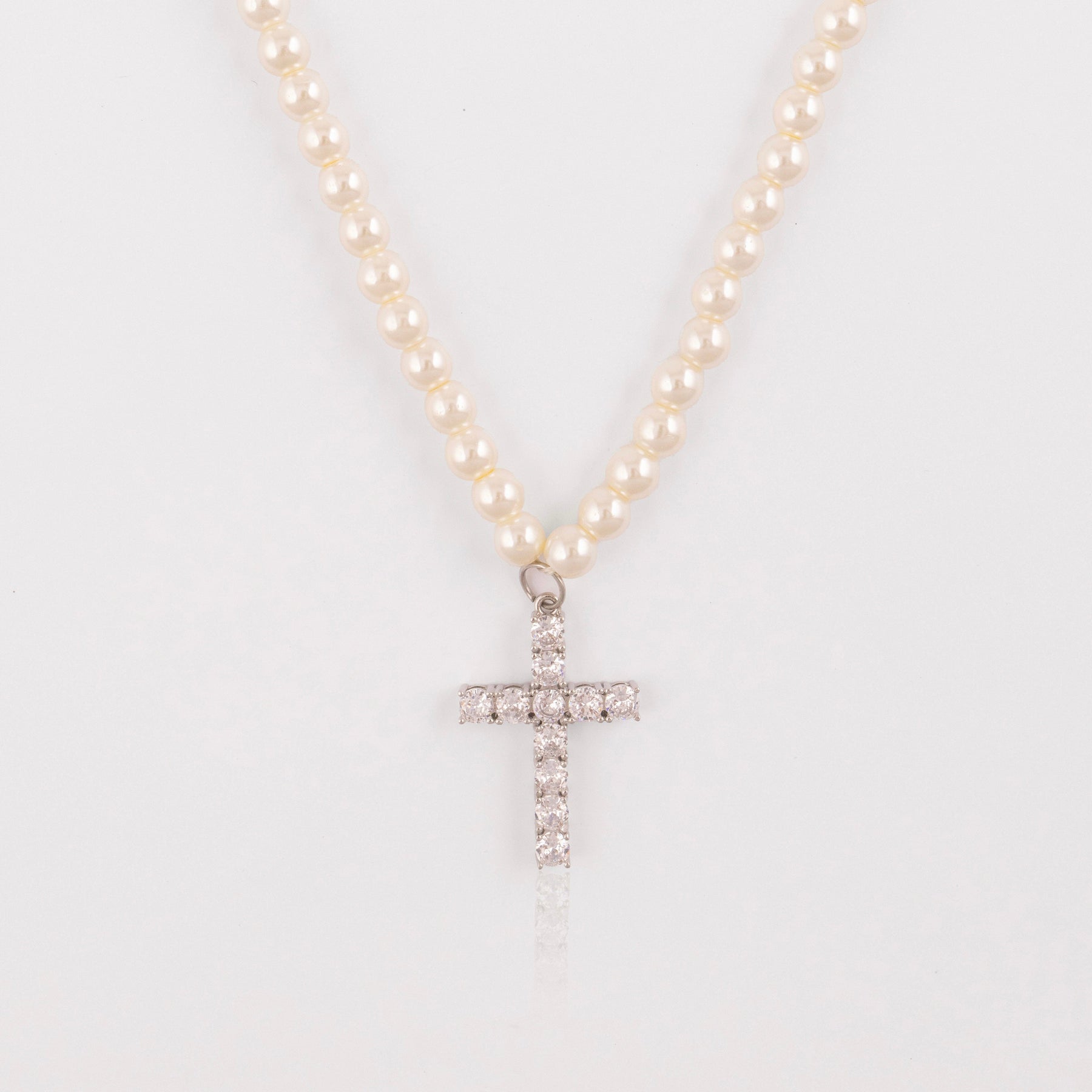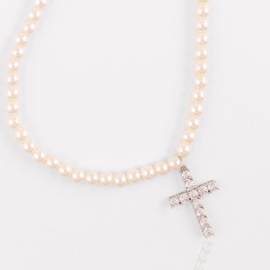 Elevate your style with this stunning pearl cross necklace from IcedOut. Featuring lustrous white pearls and a beautifully crafted cross pendant, this piece combines elegance with spiritual significance.